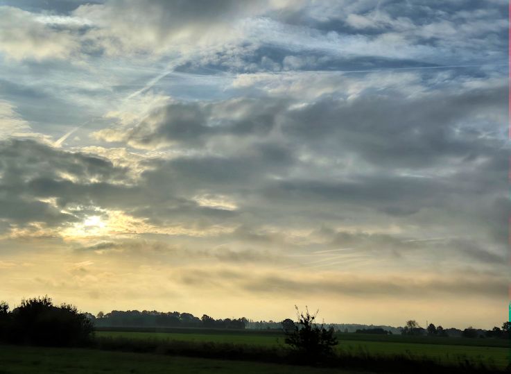 De start is vanmorgen in de kerk in Aalden. Bij het opstaan komt het water met bakken uit de lucht. De wandelaars vertrekken nog in de regenjassen, maar het wordt snel droog en het is prachtig wandelweer tot de finish. Het gaat wel waaien, maar de zon is erbij en zorgt voor schitterende wolkenluchten. De route wordt weer als prachtig...